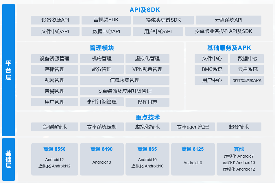 瑞馳搭載高通8550、6490、865、6125等板卡打造的新型算力基礎(chǔ)平臺(tái),具備虛擬化開(kāi)發(fā)能力、安卓系統(tǒng)軟件能力、音視頻開(kāi)發(fā)能力、存儲(chǔ)能力和基于ARM架構(gòu)的計(jì)算能力。