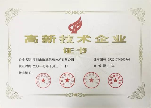 高新技術(shù)企業(yè)認(rèn)定嚴(yán)苛,企業(yè)必須同時(shí)滿足知識(shí)產(chǎn)權(quán)、科技成果轉(zhuǎn)化能力、企業(yè)經(jīng)營(yíng)成長(zhǎng)性指標(biāo)等條件。瑞馳通過嚴(yán)格審核,近日已成功獲取了由深圳市科技創(chuàng)新委員會(huì)、深圳市財(cái)政委員會(huì)、深圳市國(guó)家稅務(wù)局及深圳市地方稅務(wù)局聯(lián)合頒發(fā)的《高新技術(shù)企業(yè)證書》,正式晉升國(guó)家高新技術(shù)企業(yè)行列!