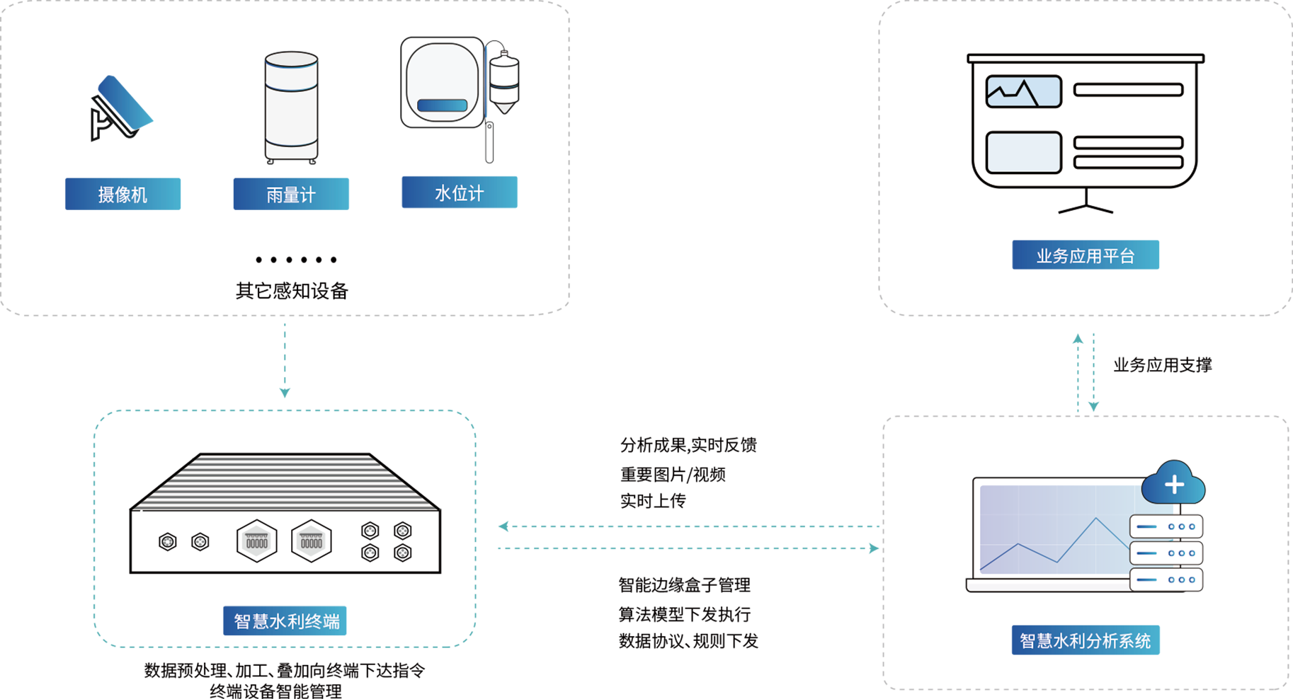 智能網(wǎng)關(guān)是一款結(jié)合視頻分析技術(shù)及物聯(lián)網(wǎng)感知設(shè)備的軟硬一體設(shè)備,支持排水檢測(cè)、水尺識(shí)別、漂浮物檢測(cè)、游泳檢測(cè)、釣魚檢測(cè)、區(qū)域入侵等多種檢測(cè)算法,并提供了RS232、RS485、DI及DO接口,可接入7款物聯(lián)網(wǎng)感知設(shè)備。智能網(wǎng)關(guān)具有寬溫工作、防水防塵、無線通訊等特色,適用于水利水務(wù)、安防應(yīng)急的多種場(chǎng)景。